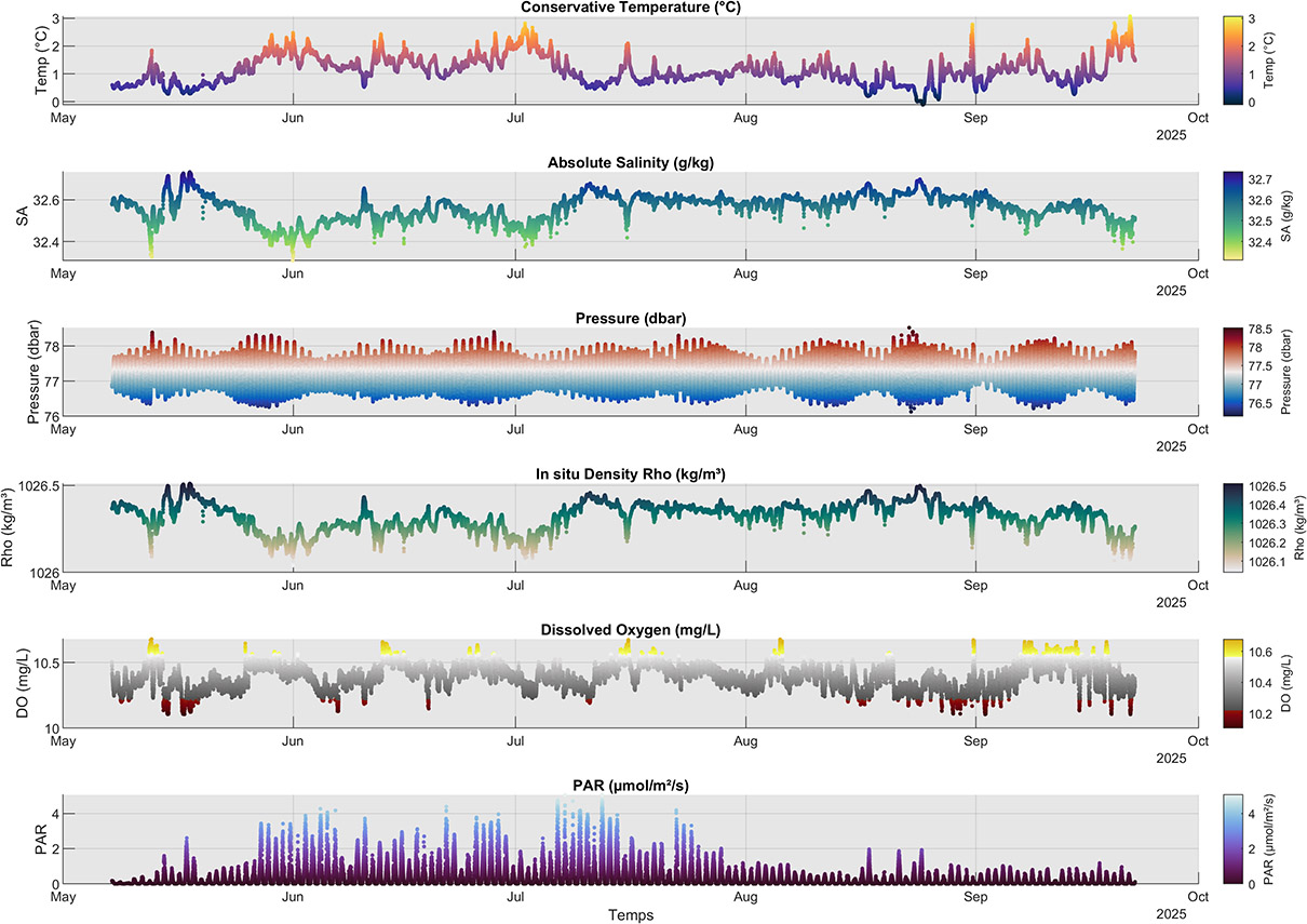 Les premiers résultats de la campagne confirment la fiabilité des mesures réalisées par les drones sous-marins (AUV) en comparaison avec les instruments fixes déployés sur place. Cette cohérence valide l’utilisation de ces outils pour étudier les écosystèmes marins, même dans des conditions difficiles comme celles rencontrées sur l’archipel : brouillards fréquents, courants changeants et eaux froides.
